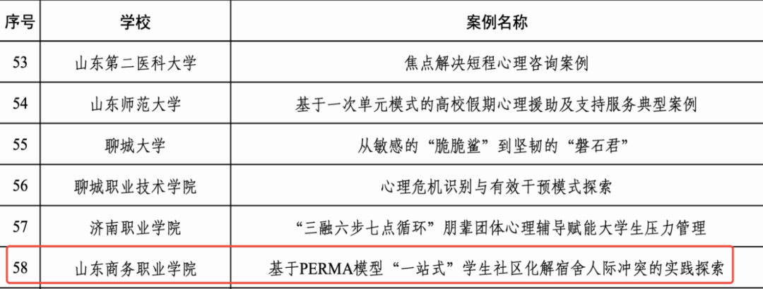 近日,在教育部思想政治工作司开展的2025年度高校思想政治工作质量提升综合改革与精品建设项目遴选中,山东商务职业学院学生工作处大学生心理健康教育中心组织申报的《基于PERMA模型“一站式”学生社区化解宿舍人际冲突的实践探索》成功入选“2025年度高校学生心理健康教育指导典型案例”。