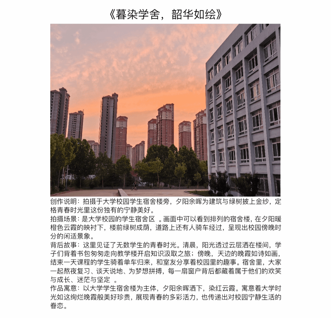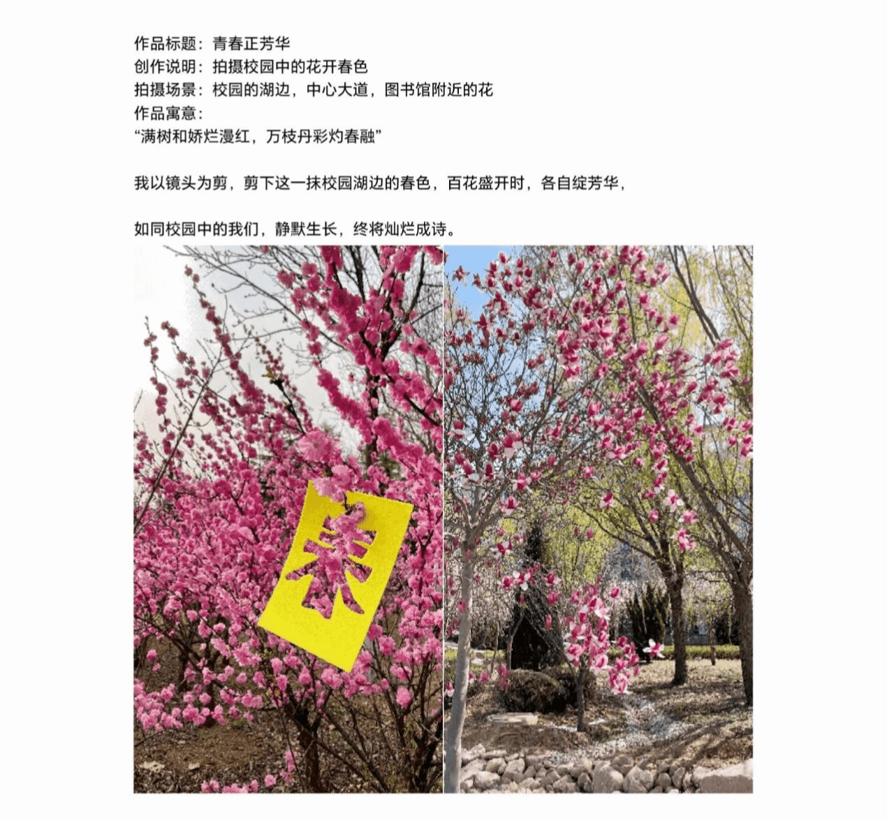 本次大赛评审团由宣传统战部老师与社区辅导员联合组成,从主题契合度、艺术表现力、情感传递三个维度综合评选,并通过微信公众号开展网络投票,共有3000多人参与。通过三轮评选,最终24托三洪悦然《青春正芳华》、23英五张亚拿《春日绿意》、23英五贾盼盼《幕染学舍,韶华如绘》等三幅作品凭借独特视角、优美创意获 一等奖。所有获奖作品通过公寓管理中心公众号、社区文化墙等平台进行线上线下联展,以在全校师生中营造爱我社区的良好氛围。