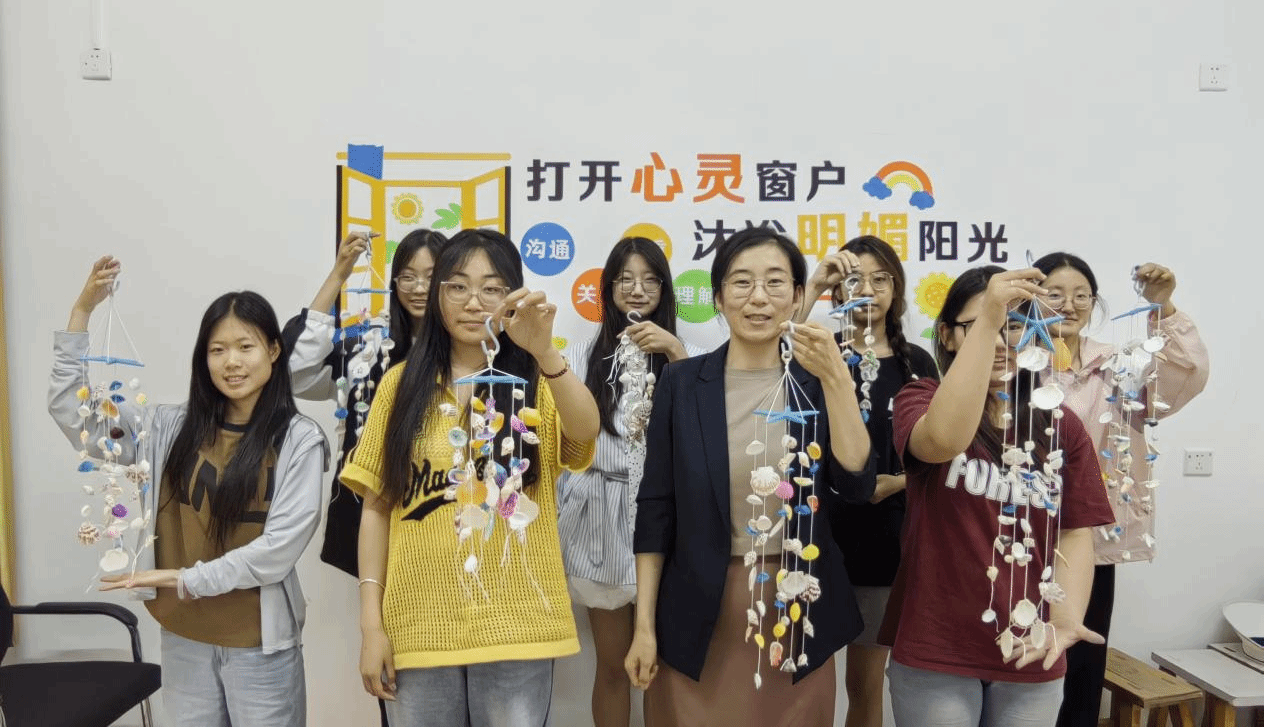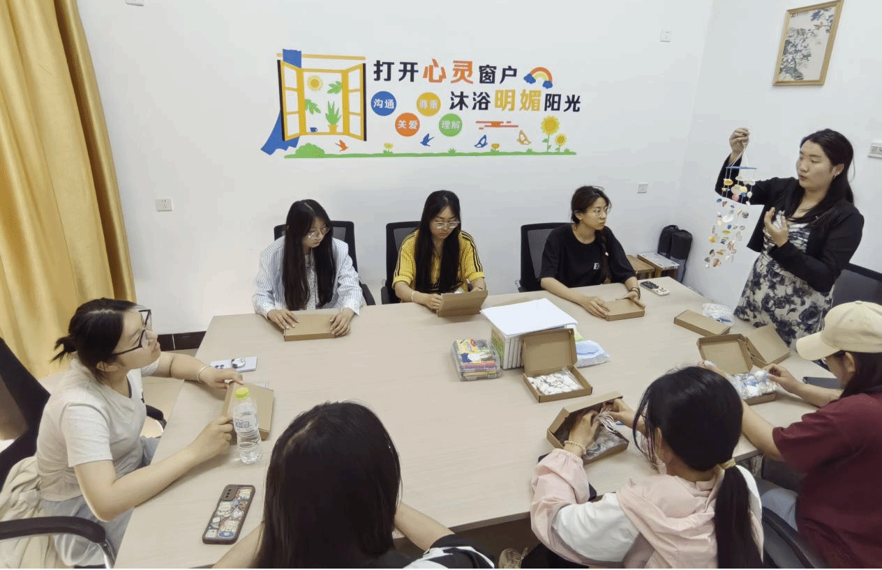贝壳风铃DIY现场布置温馨,充满了大海的清新气息。同学们在志愿者的指导下,精心挑选贝壳、海星等材料,用画笔自由涂色,用麻绳组装创作出独特的风铃。24级室内艺术设计专业徐彩云同学分享道:“听着贝壳风铃清脆的声音,感觉整个人都平静下来了。这种活动比单纯的心理讲座更有吸引力,让我们在手工创作中自然释放情绪。”