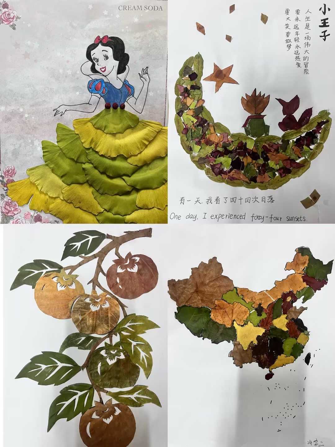 本次活动以“秋天”为创作方向,鼓励同学们走出教室,在校园的林荫道、草坪间收集秋日馈赠。24级应用英语2班沈怡晴同学将叶脉清晰的梧桐叶裁剪、折叠,精心粘贴成信封的形状,仿佛能将秋日的私语装进其中,寄往远方;24级学前教育2班李梦灿同学以不同形状色彩的秋叶粘贴出经典画面,叶片的纹理成了星球表面的独特印记,让童话场景在秋叶上焕发生机;24学前教育2班解海燕同学以中国地图为蓝本,搜集不同形状、色彩的秋叶,一片片拼贴出中国地图的轮廓,用自然之美致敬家国情怀。