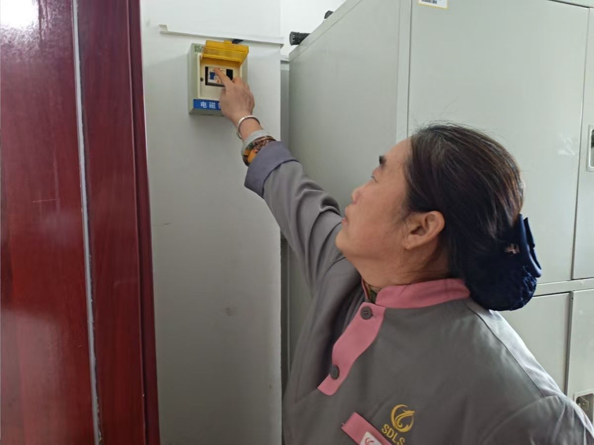 消防演练在笃行苑A栋进行。值班员在接到学生报告火情后,第一时间按下电磁开关、打开应急广播,并拨打相邻值班室电话寻求增援;随后拿起灭火器到现场扑救,增援的值班员打开电磁门,在出口位置打开手电引导学生疏散;若火情得不到控制,迅速拨打学校安保电话寻求帮助。
