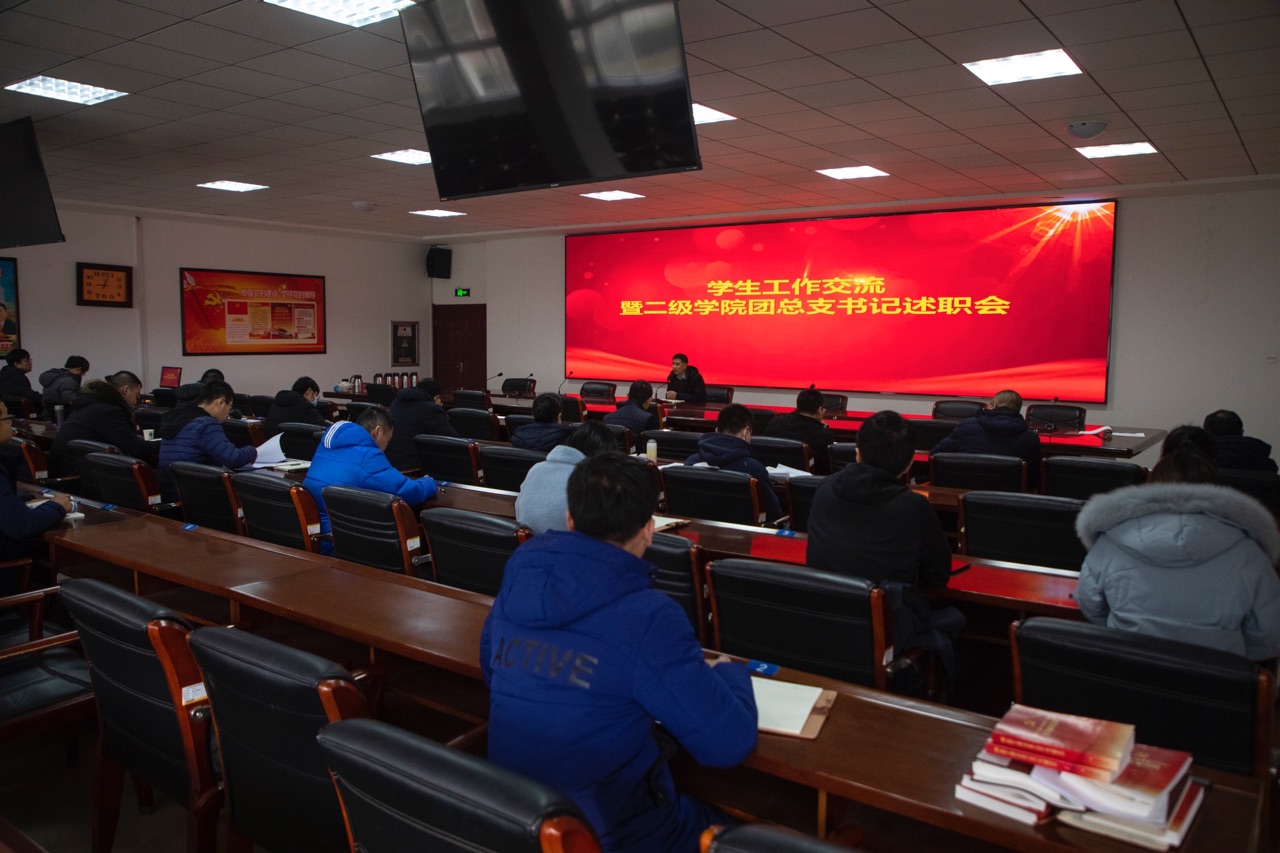 本站讯 1月10日我校召开了学生工作交流暨二级学院团总支书记述职大会。学生工作处(团委)副科以上干部,各二级学院分管学生工作副院长(副书记)、团总支书记、宣传统战部、校企合作与就业工作处、思政理论课教学部、基础教学部等相关负责人员参加了会议。