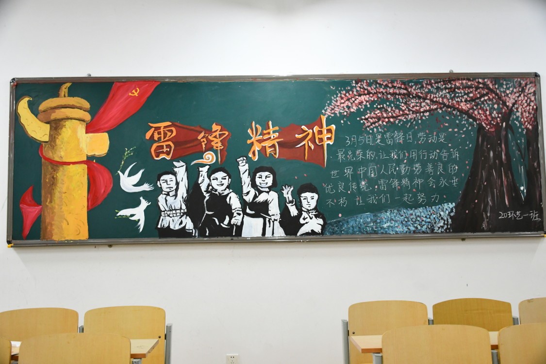 为进一步引导和激励我校学生弘扬雷锋精神,推进校园文化建设,营造文明,乐于助人的校园氛围,雷锋团支部开展“与雷锋同行”的黑板报评选活动。同学们以学习雷锋精神为主题,立志树校园班级文明新风,他们踊跃参与,热情高涨,尽情放飞思绪创作,在黑板的各个角落,奋笔疾书,挥墨作画,每个班级的黑板报都独具特色,字里行间都流露着同学们对雷锋同志的尊敬和怀念。