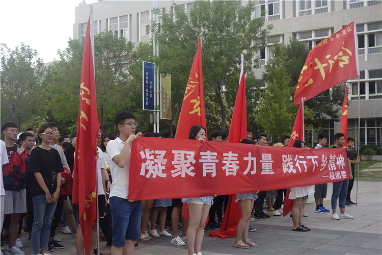为深入学习贯彻习近平新时代中国特色社会主义思想和党的十九大精神,认真落实习近平总书记视察山东重要讲话、对山东工作的重要指示要求,全面贯彻落实省第十一次党代会及省第十四次团代会精神,按照全省扶贫开发工作会议和团省委青春扶贫行动的部署,充分发挥共青团的组织优势和大学生的智力优势,培养大学生社会责任感、使命感和实践能力.我校今年继续开展2018年暑期“三下乡”社会实践活动,并于7月5日下午,在中心大道举行出征仪式。校团委、各系团总支书记、全院各系部“三下乡”社会实践30支社会实践队伍,600余名同学,参加了此次出征仪式。