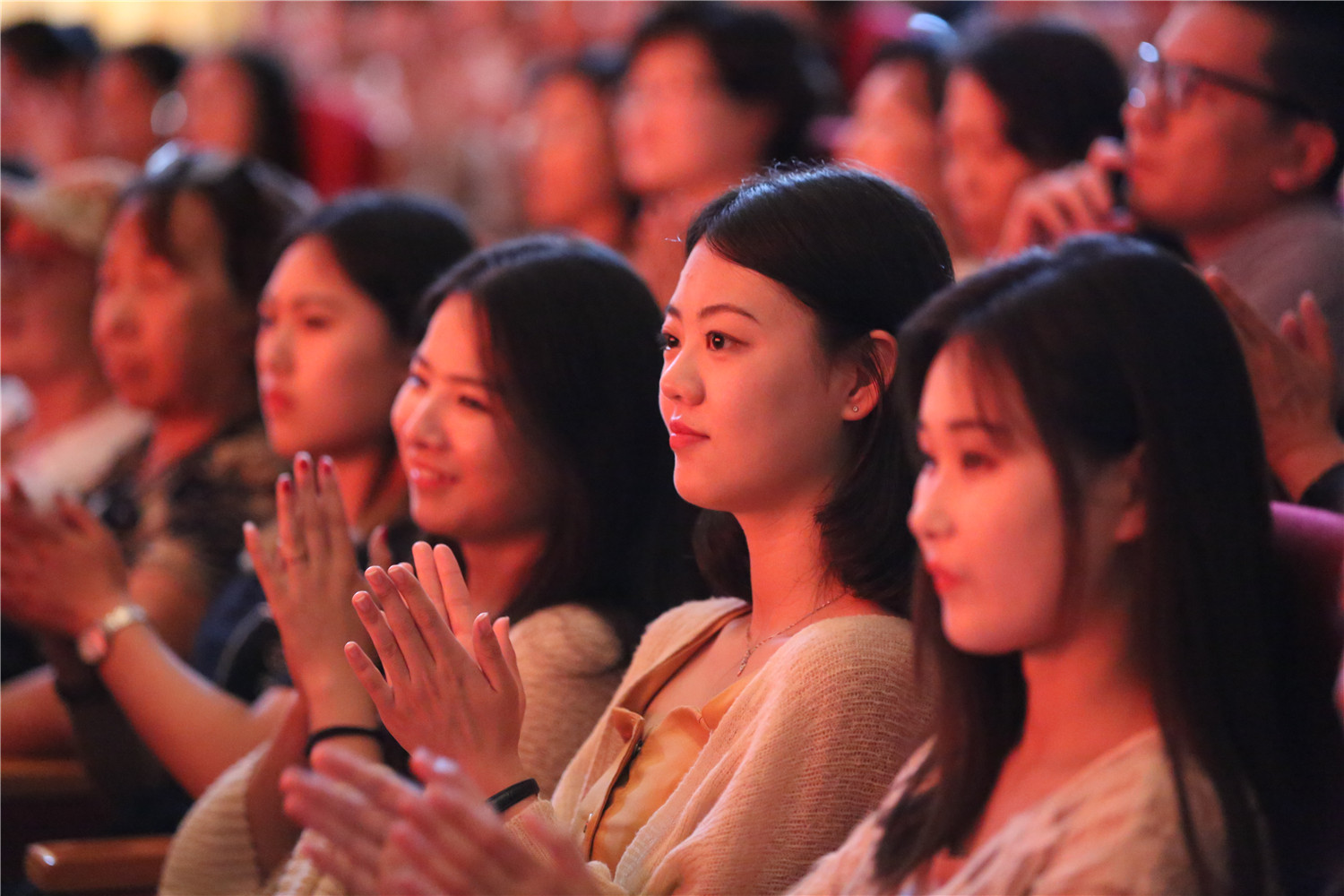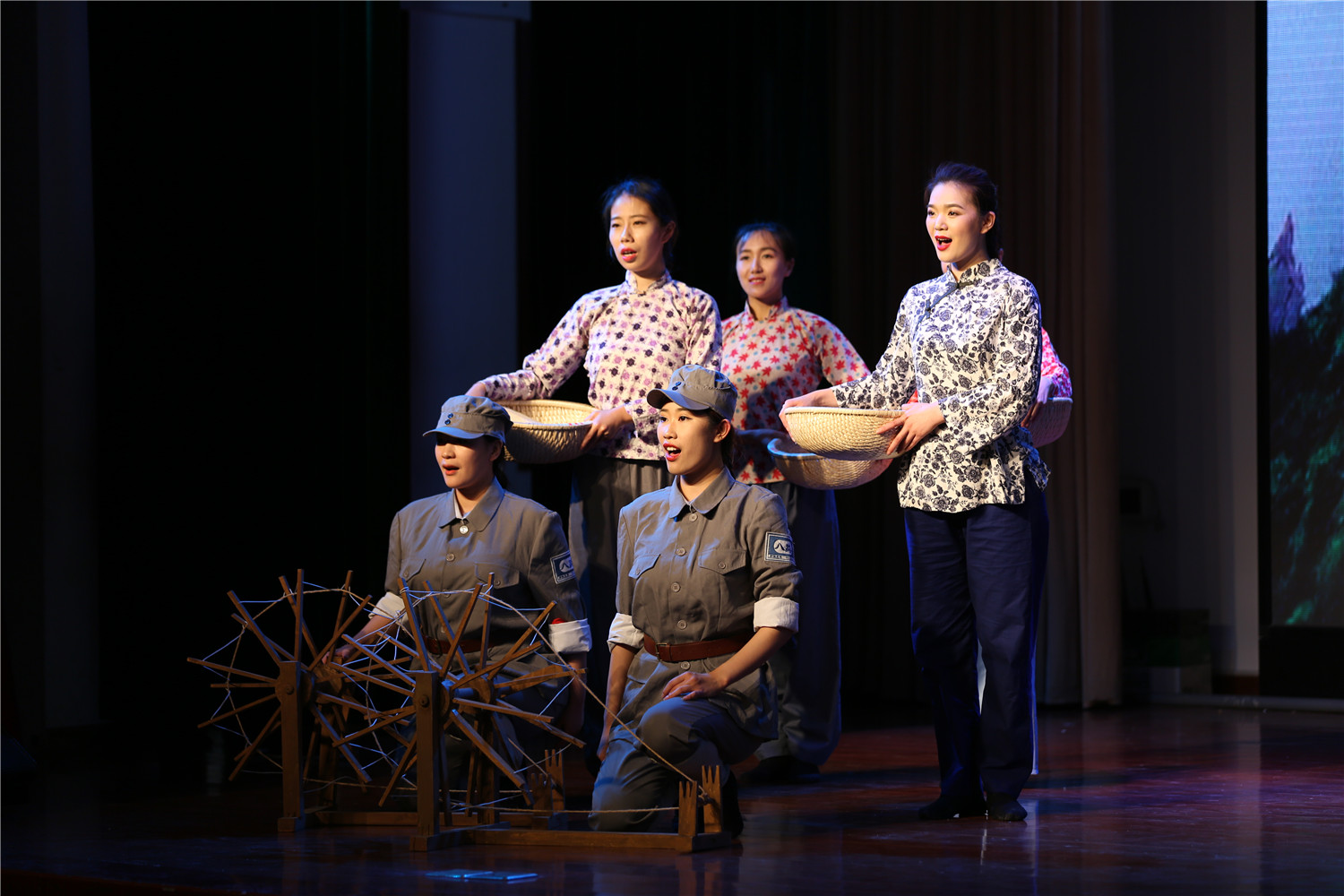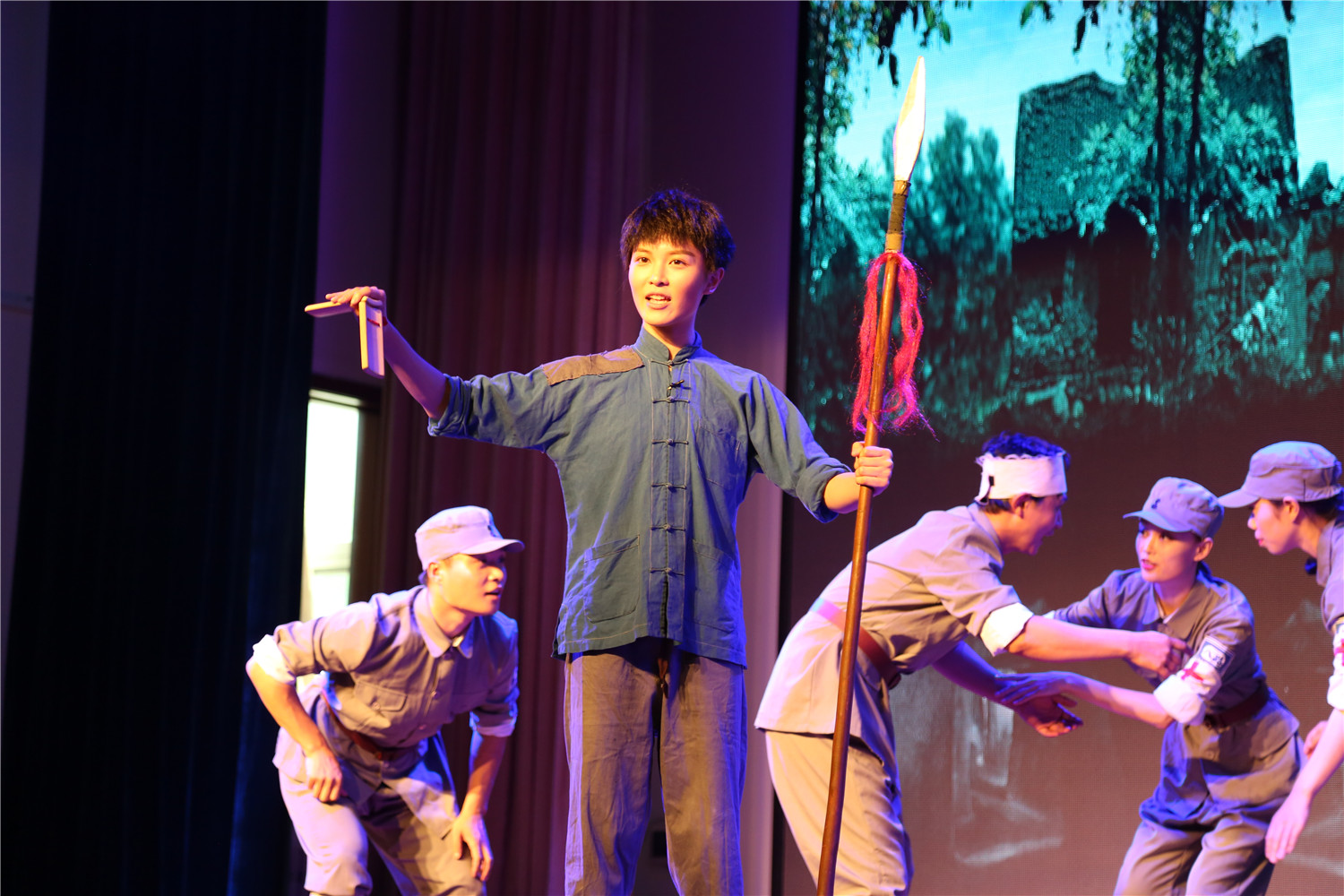 为保护八路军而献身的8岁孩子,为革命牺牲了两位子弟兵的老妈妈,23岁便献出宝贵生命猛虎斗士任常伦,一幕幕深情的演出让观众动容落泪,一个个胶东红色故事让全场师生热血满腔,在演员的带领下,全场党员起立重温入党誓词,把整个演出推向了高潮。“从小爷爷对我说,吃水不忘挖井人,曾经苦难才明白,没有共产党哪有新中国。从小老师教我唱,唱支山歌给党听,几经风雨更懂得,跟着共产党才有新中国……”在观众熟悉的悠扬歌声中,由全体歌舞演员共同参演的大歌舞《灿烂阳光》最后一个登场。闪耀着金光的铁锤镰刀,代表着民族的希望,演员们的深情表演,现场掌声经久不息。