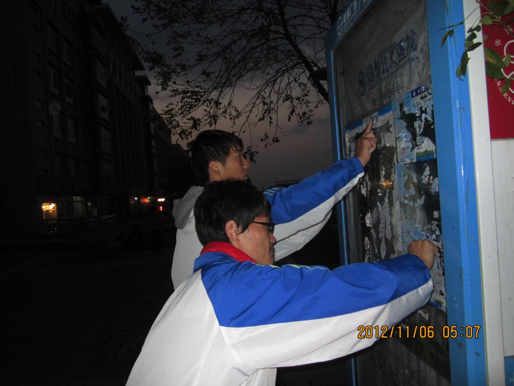 2012年11月6日,为了响应学校号召,更好的维护校园环境,还给同学们一个洁净的校园,由院劳卫部组织的一次“清理校园小广告”的志愿活动在中心大道展开。