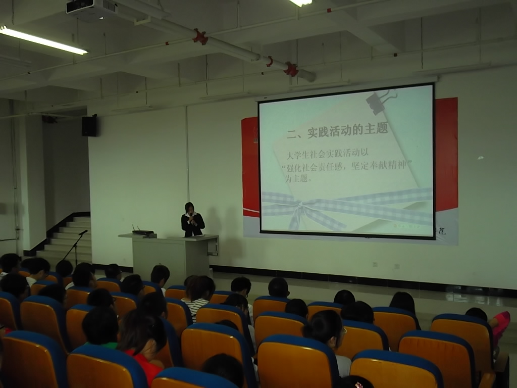 随后,进行了2012年暑期大学生社会实践交流,2012年暑期我院按照中宣部、中央文明办、教育部、团中央、团省委深入开展大学生志愿者暑期“三下乡”社会实践活动的统一部署及省委、省政府的具体要求,动员我院学生志愿者广泛深入地开展了文化、科技、卫生“三下乡”社会实践活动。我院广大青年学生在社会实践中为基层提供了力所能及的服务,各系部团总支组织周密部署、加强指导,广大青年学生积极参与、扎实服务,共组建19支社会实践代表队,充分发挥了实践教育在大学生思想政治教育中的积极作用。在2012年暑假大学生社会实践总结大会上,各系老师和学生代表走上台演讲台,他们用文字、图片、视频等完美的再现了社会暑期社会实践的实况,展现了我院广大青年学生在社会实践中的别样精彩。