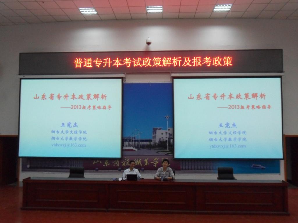 (本报讯 记者 马文普 报道)2012年6月15日下午4点30分在我院在图书馆二楼报告厅进行了一场专升本政策解析与报考政策讲座。此次讲座在我院教务处王处长的组织下,邀请烟台大学文经学院、烟台大学数学教育学院的王宪杰讲师来我院进行讲座。